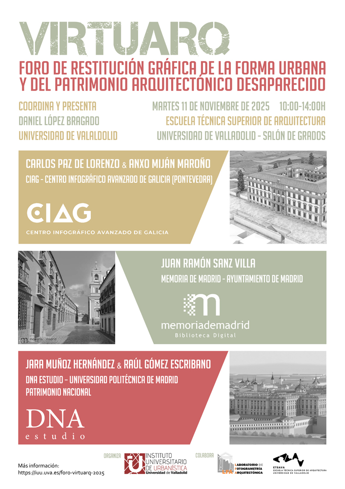 El martes 11 de noviembre de 2025, en horario de mañana, se celebrará en formato bimodal (presencialmente en la Escuela Técnica Superior de Arquitectura de Valladolid, y en emisión en directo vía YouTube) el seminario “VIRTUARQ. Foro de restitución gráfica de la forma urbana y del patrimonio arquitectónico desaparecido”, organizado por el IUU y coordinado por Daniel López Bragado.