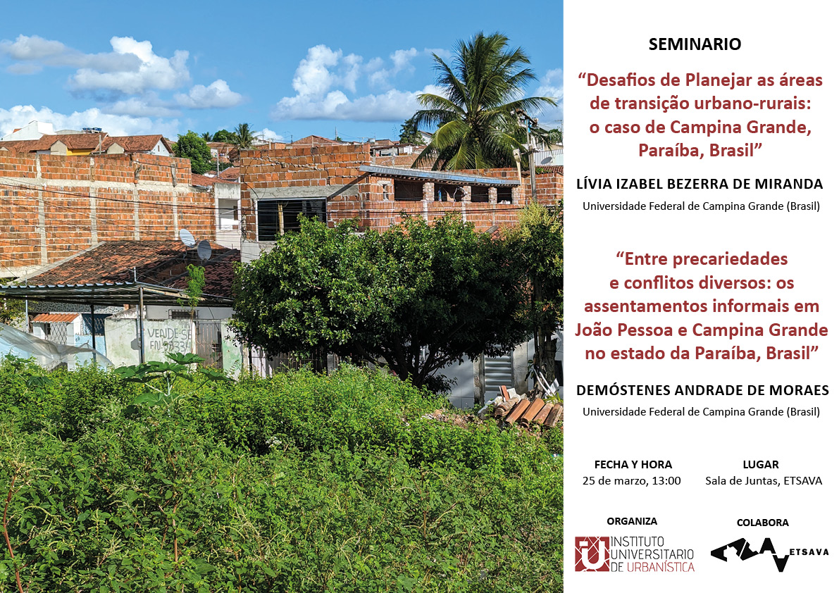 El próximo miércoles 25 de marzo, el Instituto Universitario de Urbanística presentará un nuevo seminario, esta vez con doble sesión. Por un lado, la arquitecta y urbanista, Lívia Izabel Bezerra de Miranda, bajo el título “Desafios de Planejar as áreas de transição urbano-rurais: o caso de Campina Grande, Paraíba, Brasil”, discutirá las formas de planificación para espacios de transición urbano-rural en ciudades intermedias de Brasil. La investigadora presentará, con base en sus investigaciones, las principales dificultades identificadas en la producción, planificación y regulación de estos espacios.